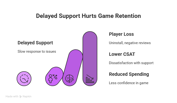 Slow responses inevitably feel like abandonment. Players might tolerate one slow resolution, but repeated delays push them to uninstall, leave a negative review, or move to a competitor that feels more responsive.