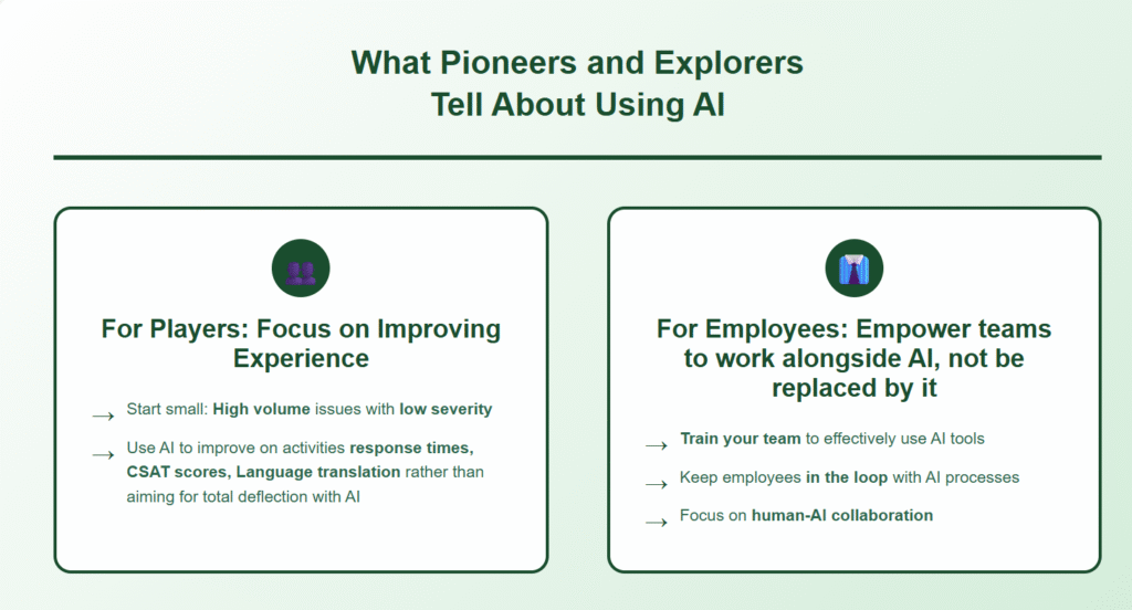 Both Explorers and Pioneers believe that with proper training and change management, there will always be a human in the loop, especially for high-value players, and to handle support that requires empathy and human judgment that automated systems cannot.